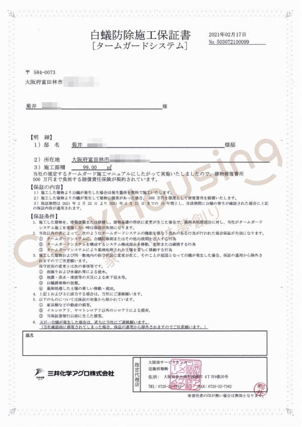 住宅がシロアリ被害に遭わないように、「タームガード」という施工を行っています。シロアリへの対策もしっかりと行っています。