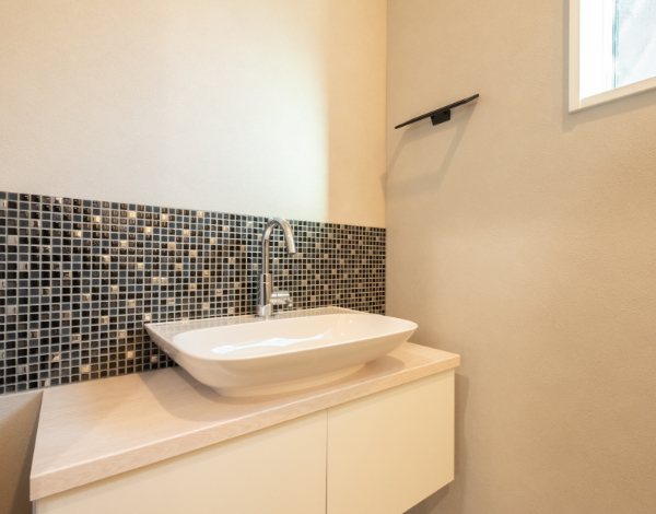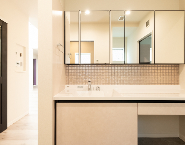 お洒落な洗面台とタイルが並ぶ洗面台。湿気が溜まりやすい洗面所も全館空調なら快適な湿度を保つ事が出来ます。